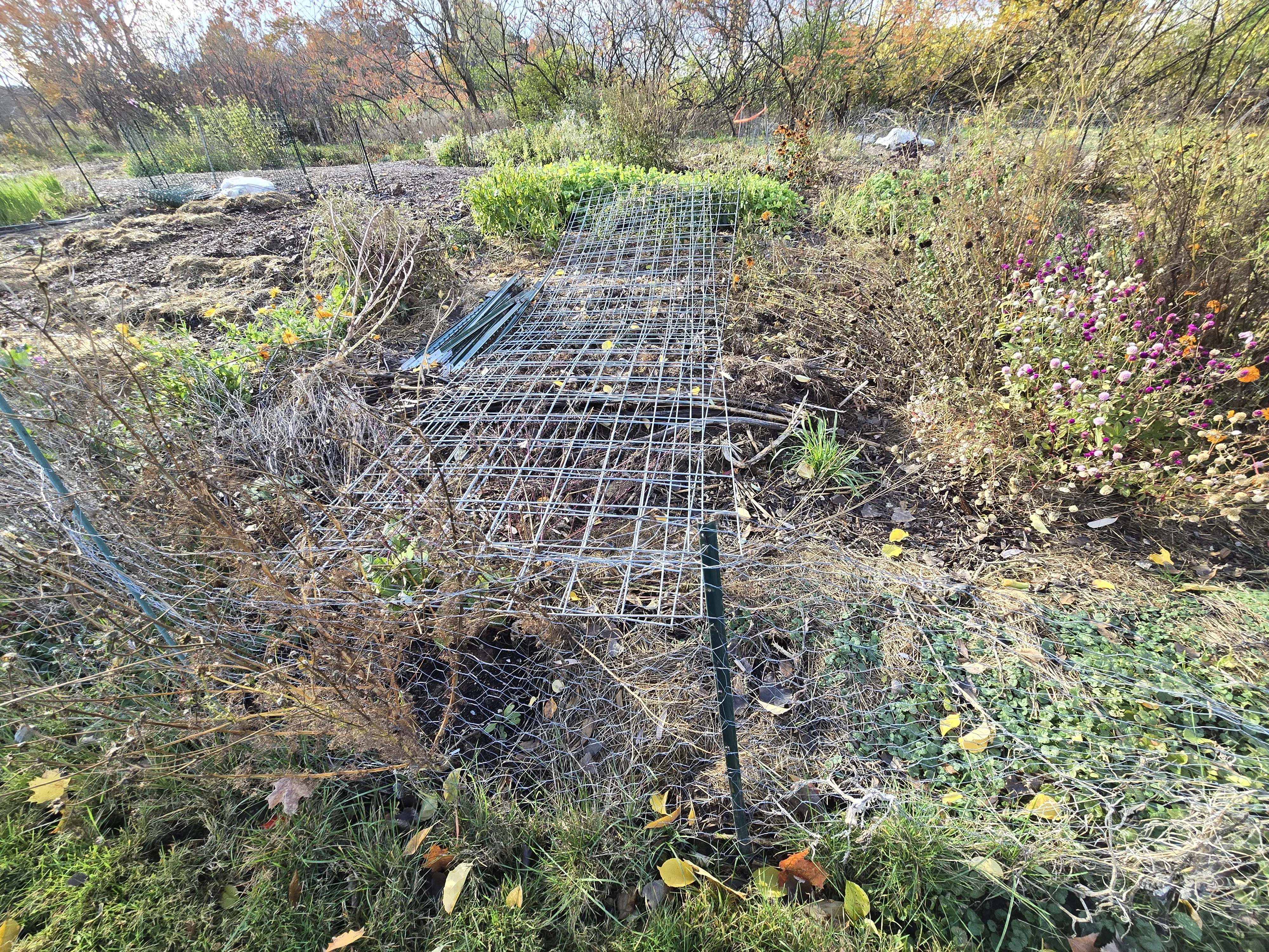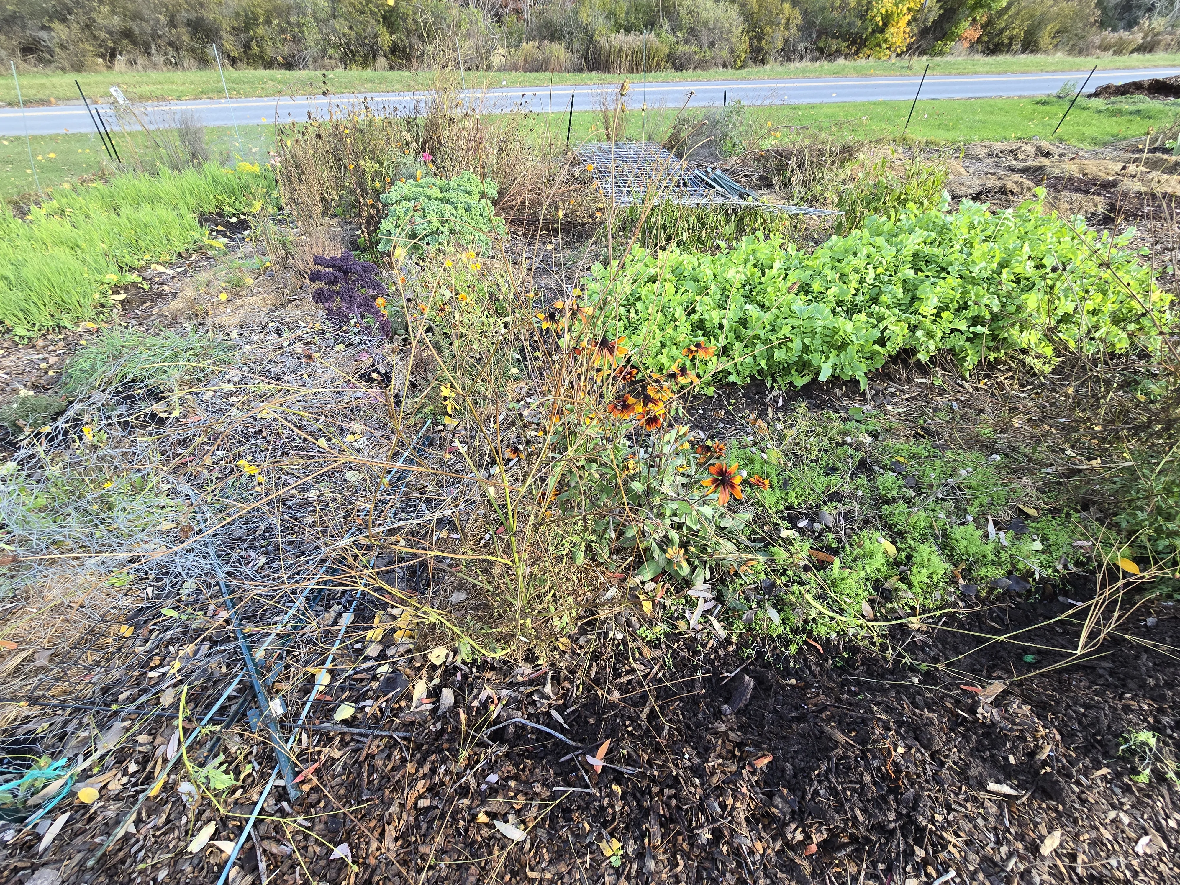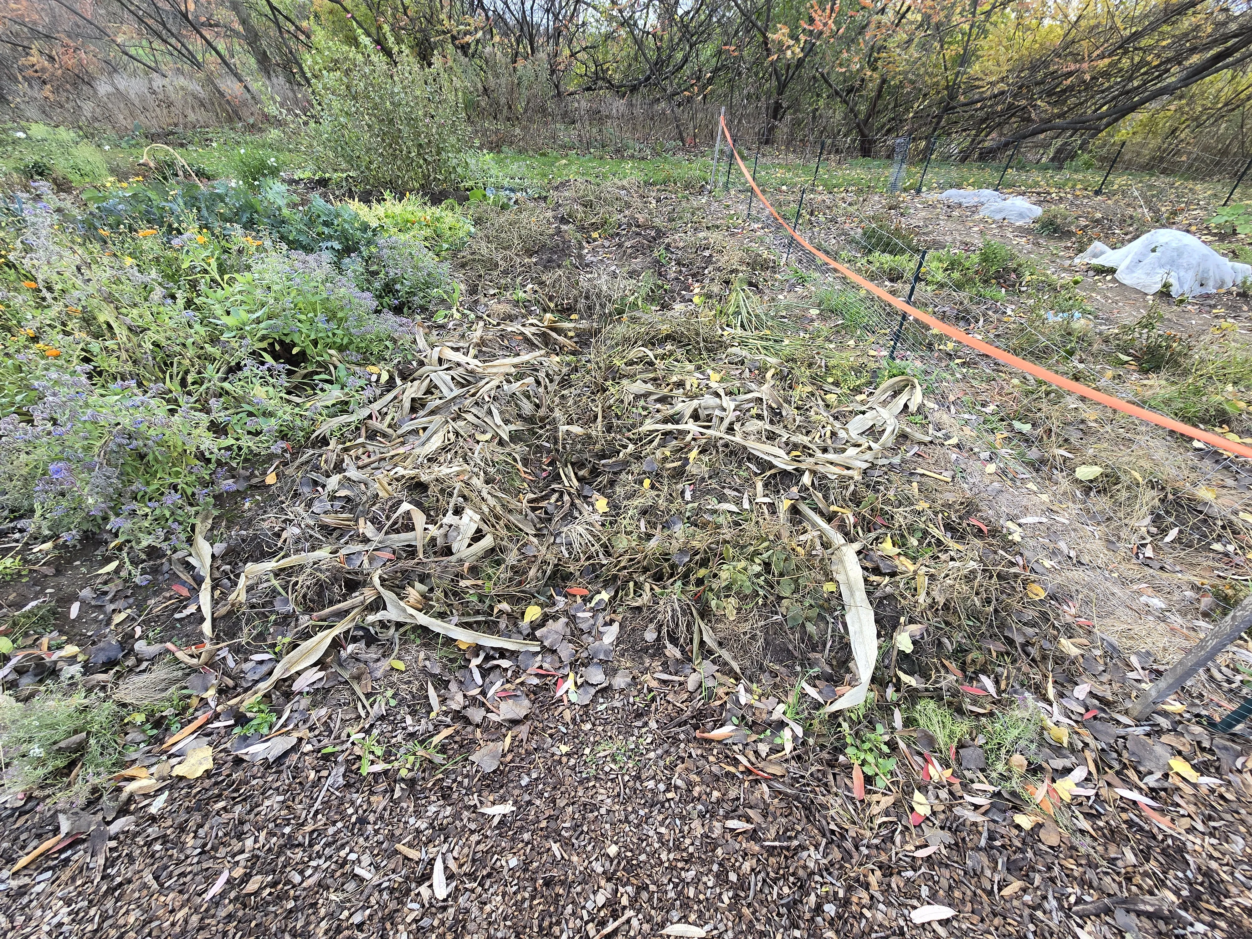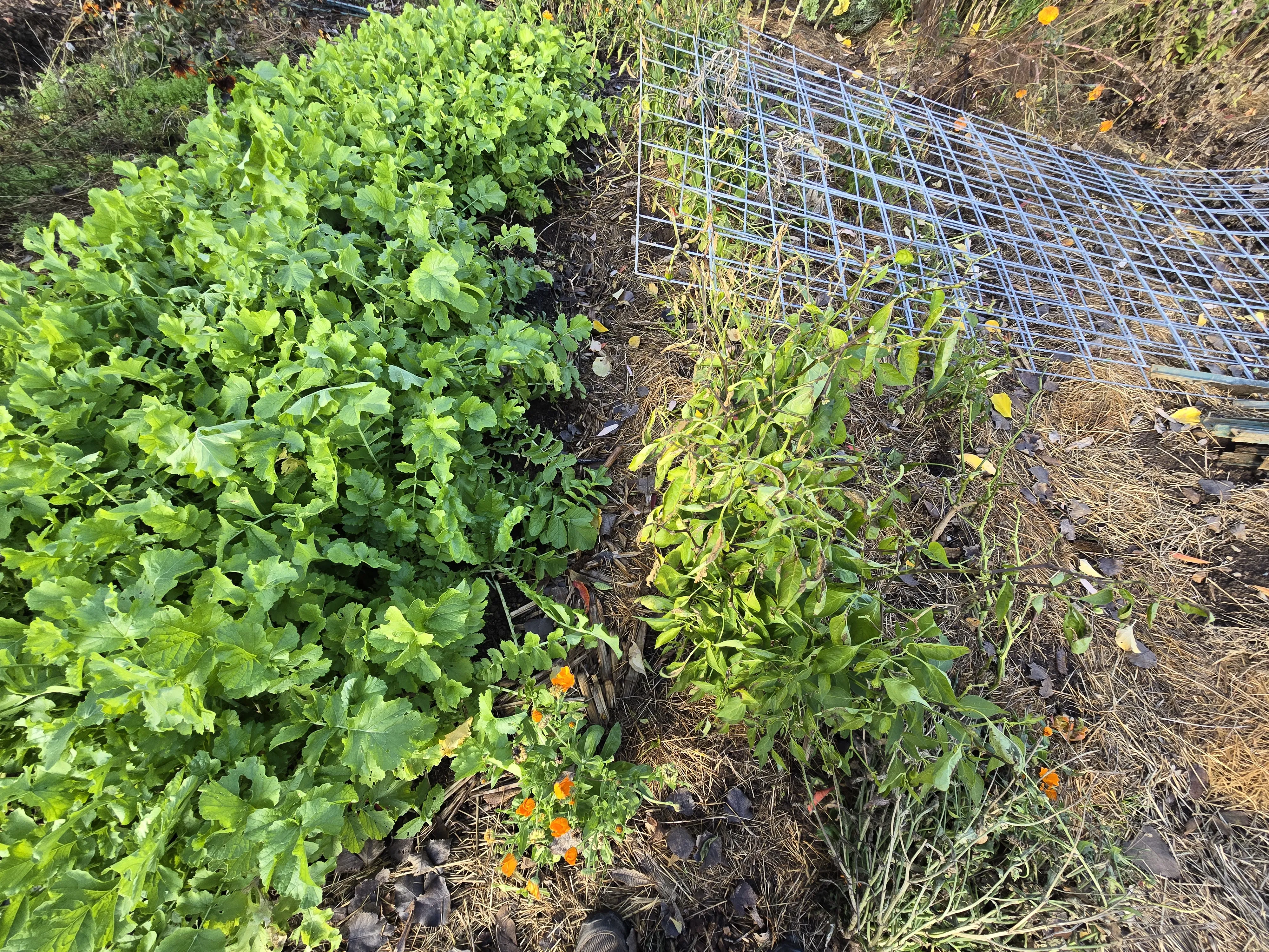 The no till bed looks more or less as I last saw it. There is still a mass of radish plants in the front. The pepper plants look quite dead, so they will definitely not last as long as the patio plants. The fencing by wood chip path was pulled so I can get through to my no till plot next year.