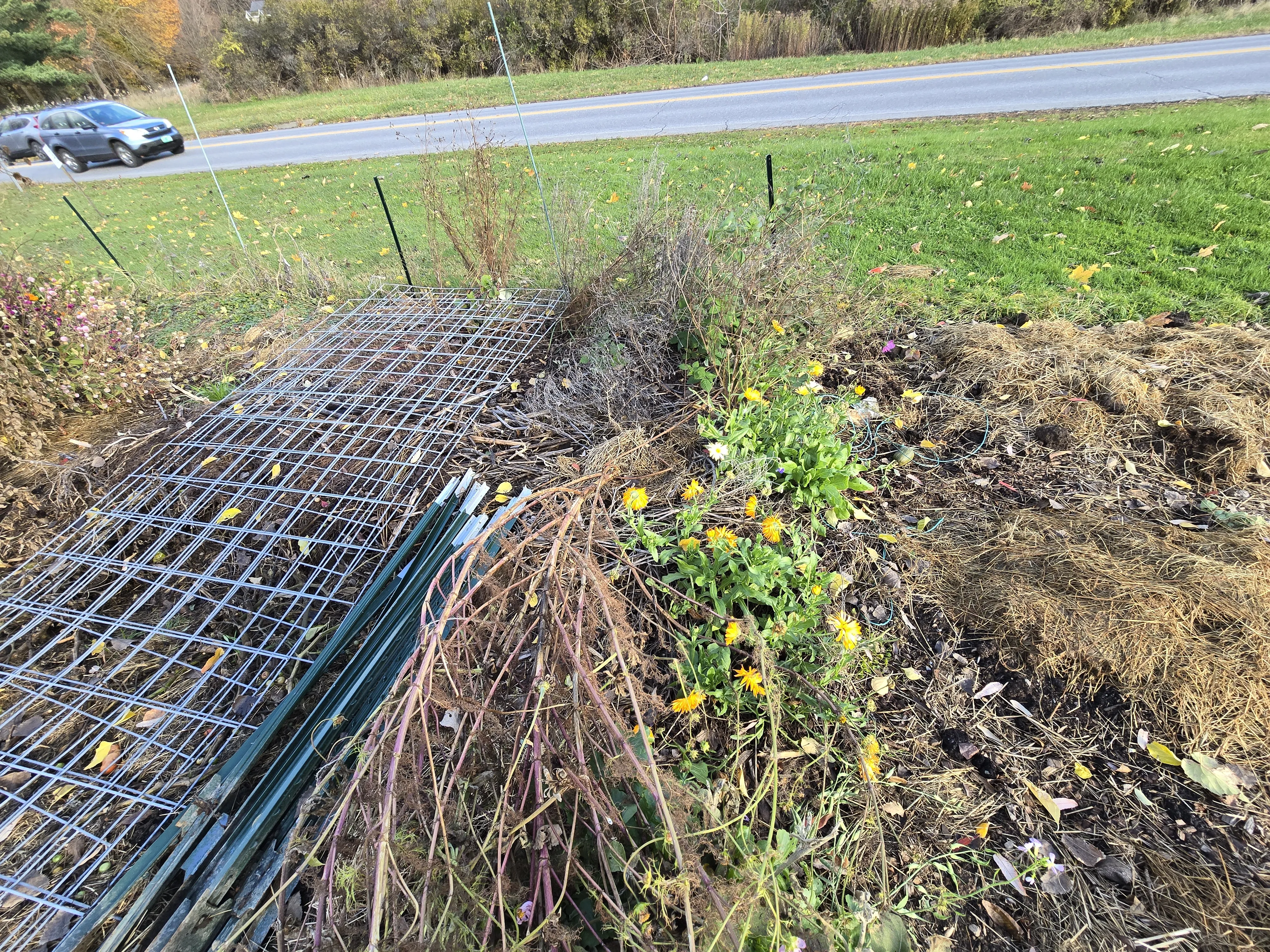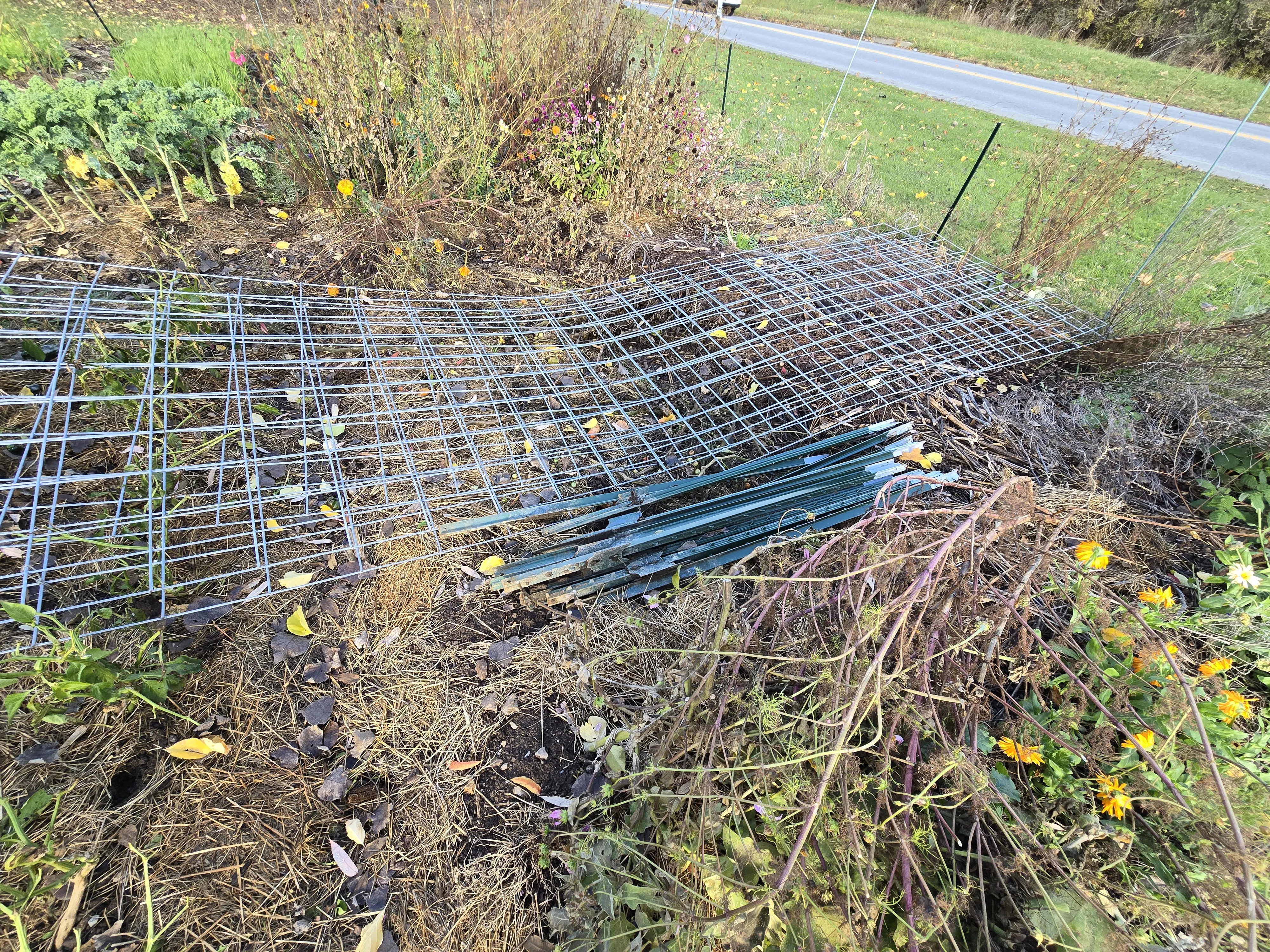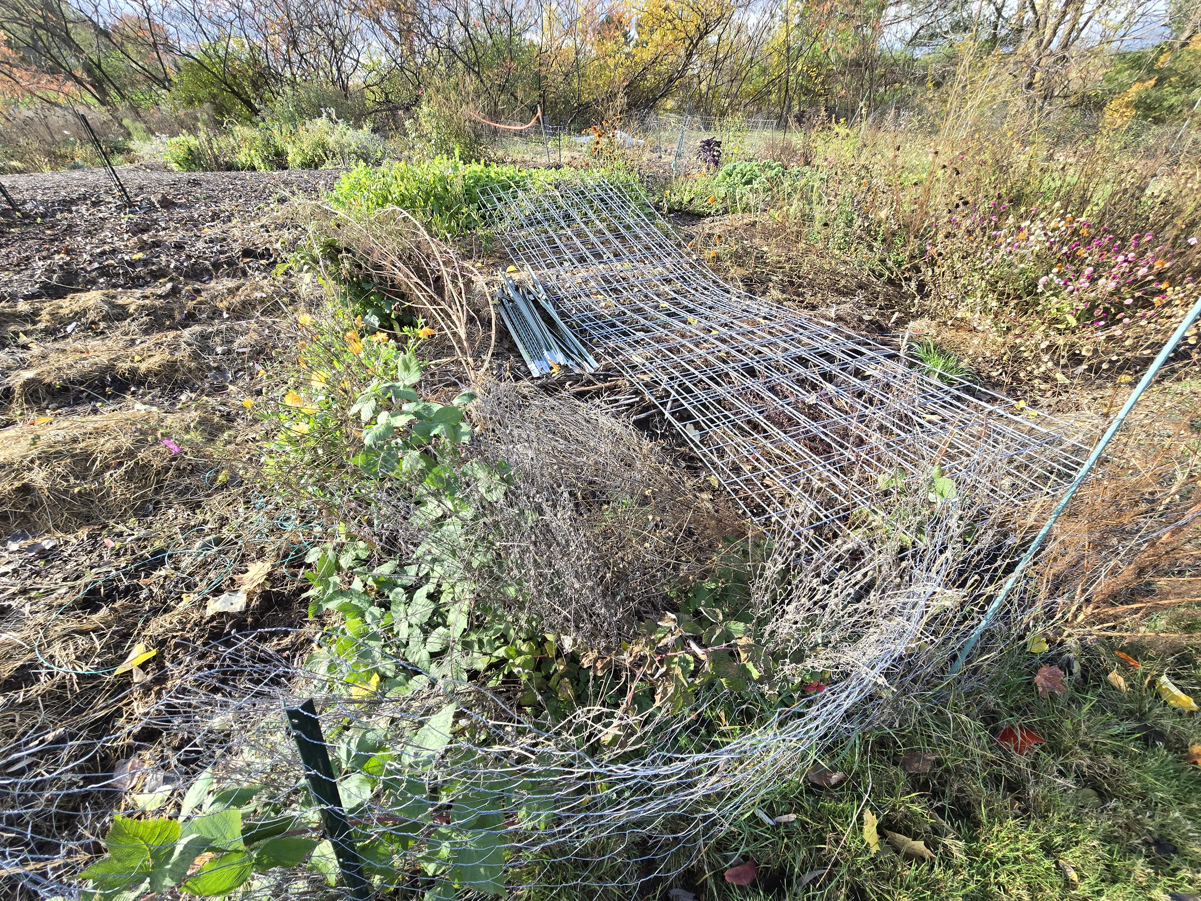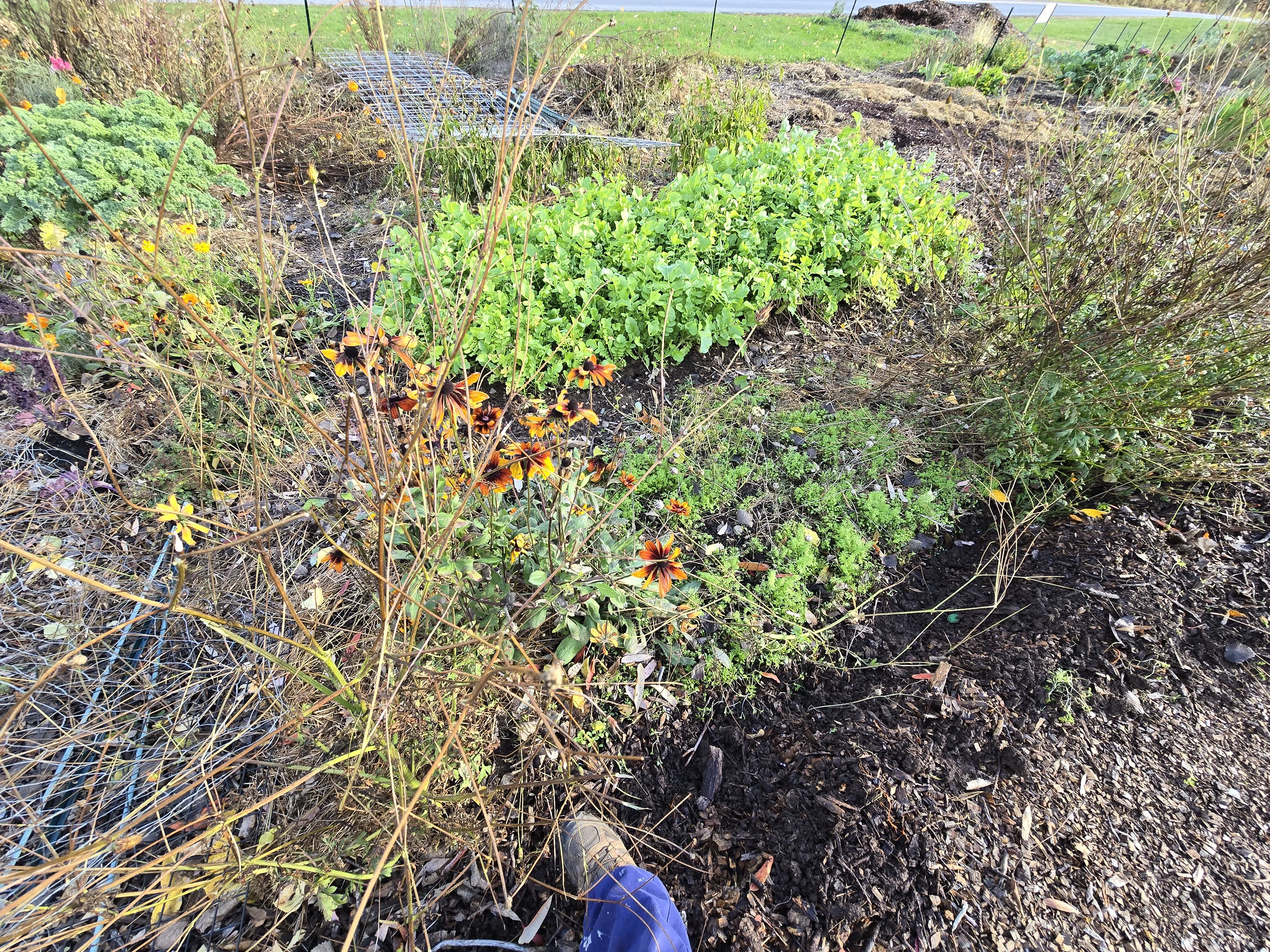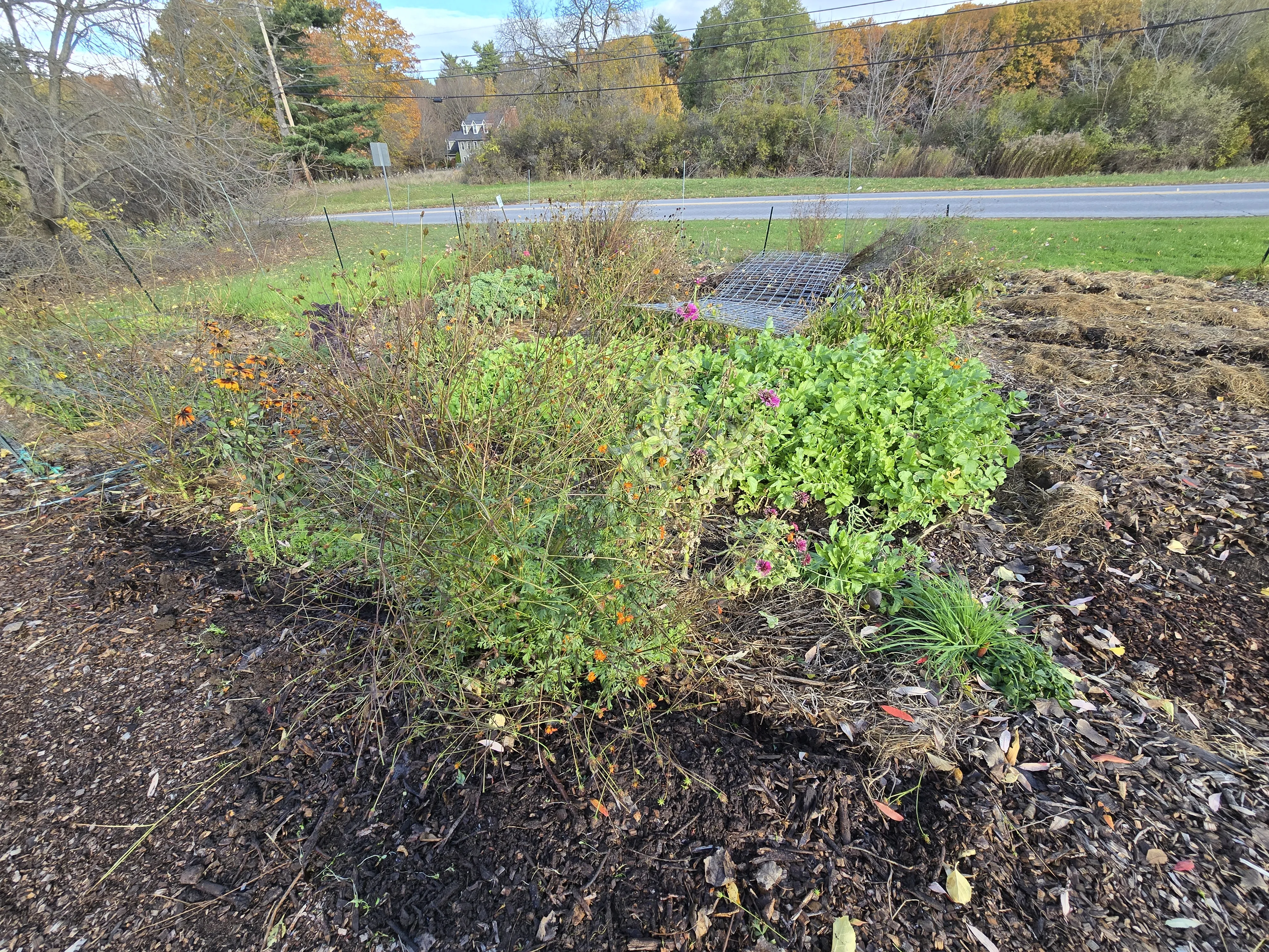 The no till bed looks more or less as I last saw it. There is still a mass of radish plants in the front. The pepper plants look quite dead, so they will definitely not last as long as the patio plants. The fencing by wood chip path was pulled so I can get through to my no till plot next year.