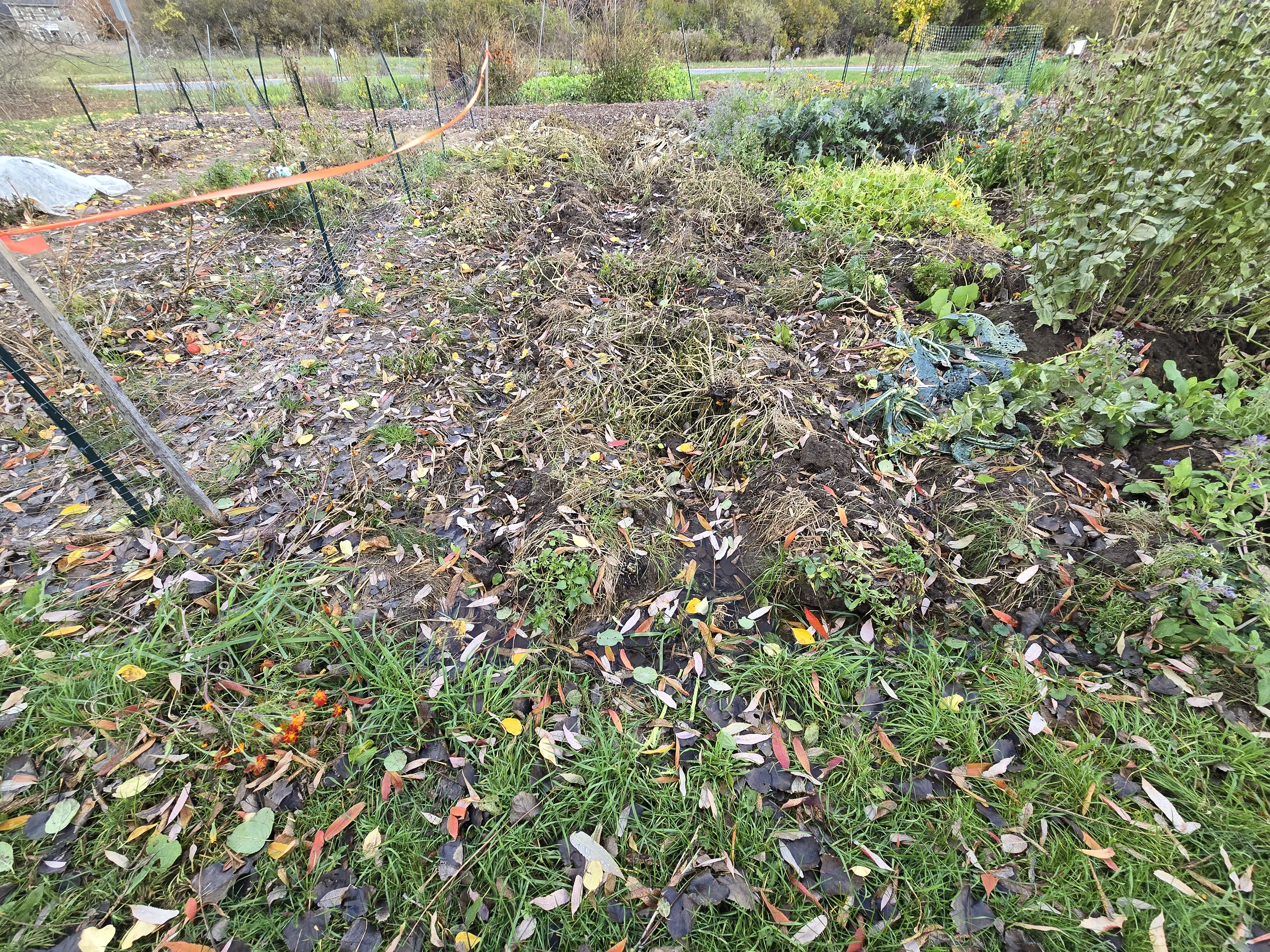 It has been a few weeks since the garden cleanup event, so I stopped in to look at the state of the gardens. Sadly, no wine cap mushrooms were found. It does look like the turned up foliage is breaking down nicely for next year. I will have to keep an eye on the pooling that occurs to the South of the tilled bed.