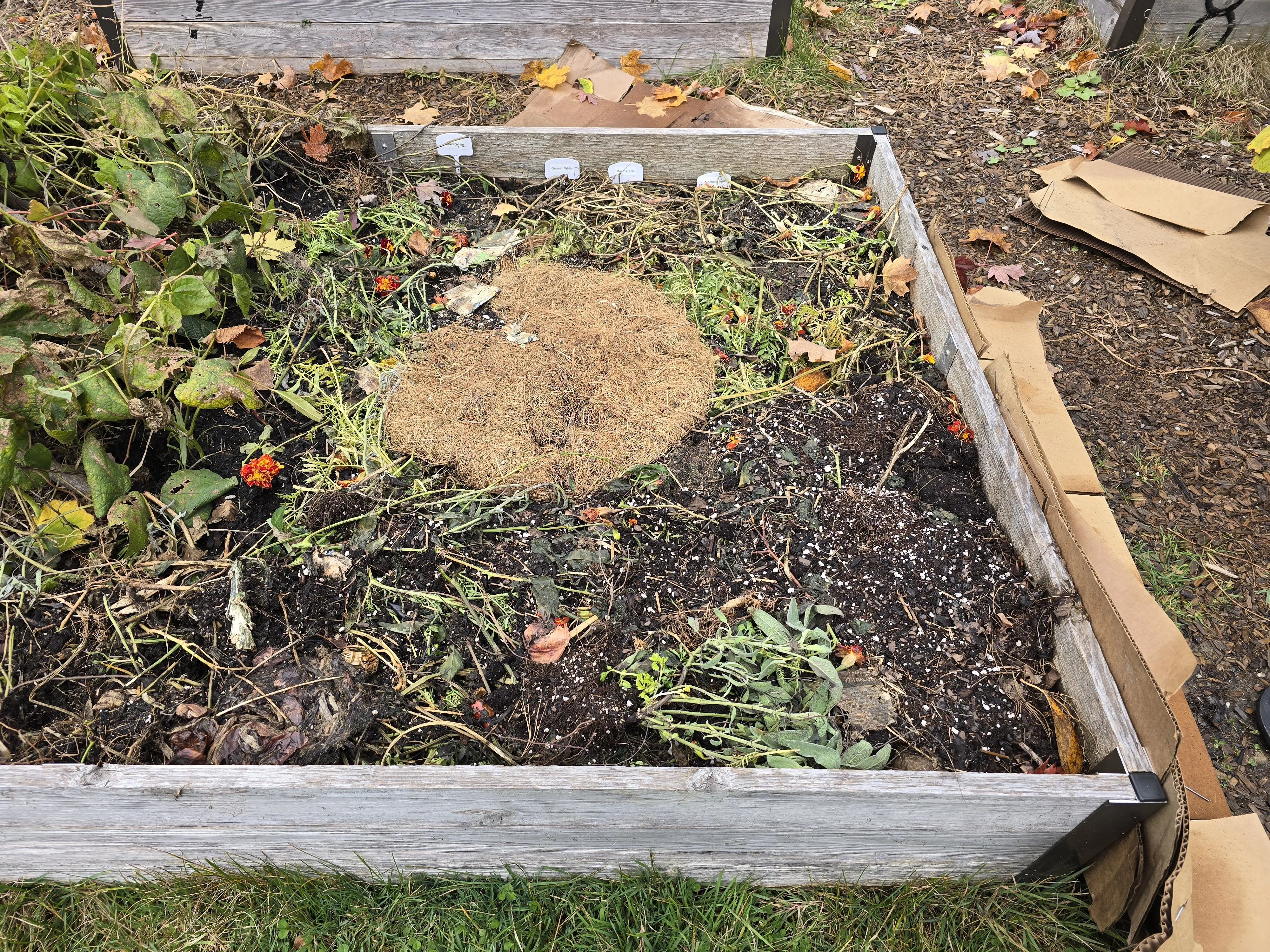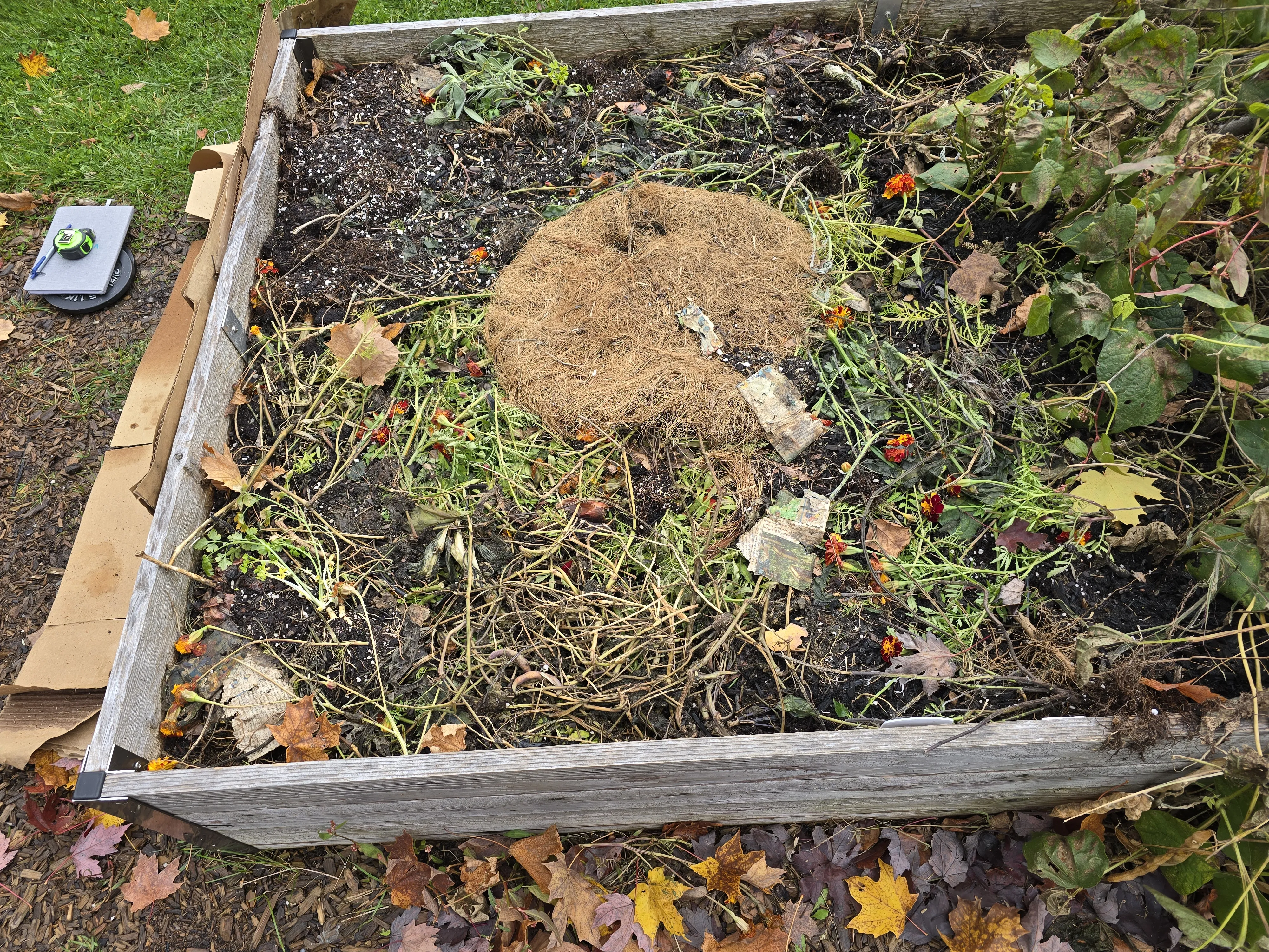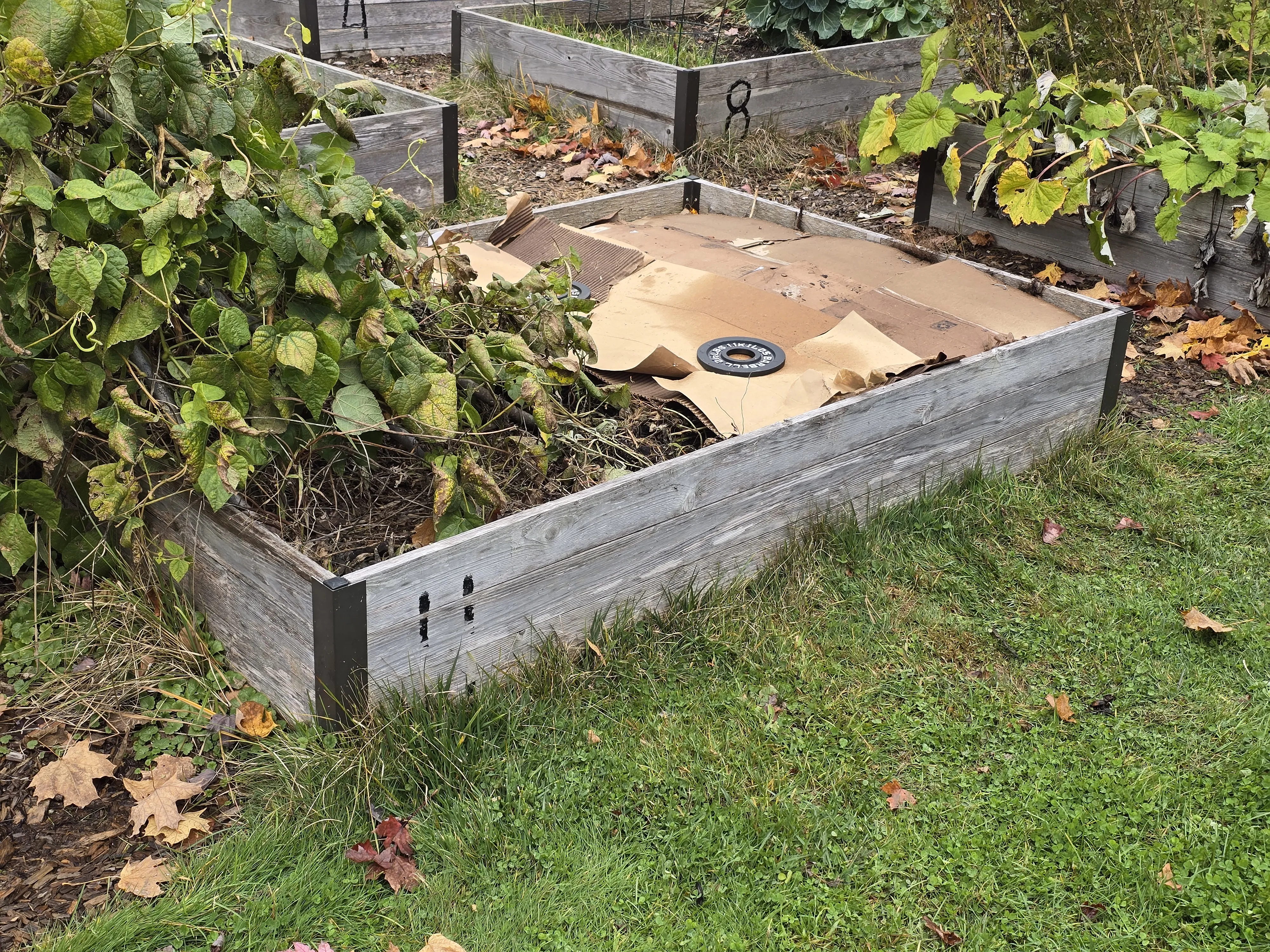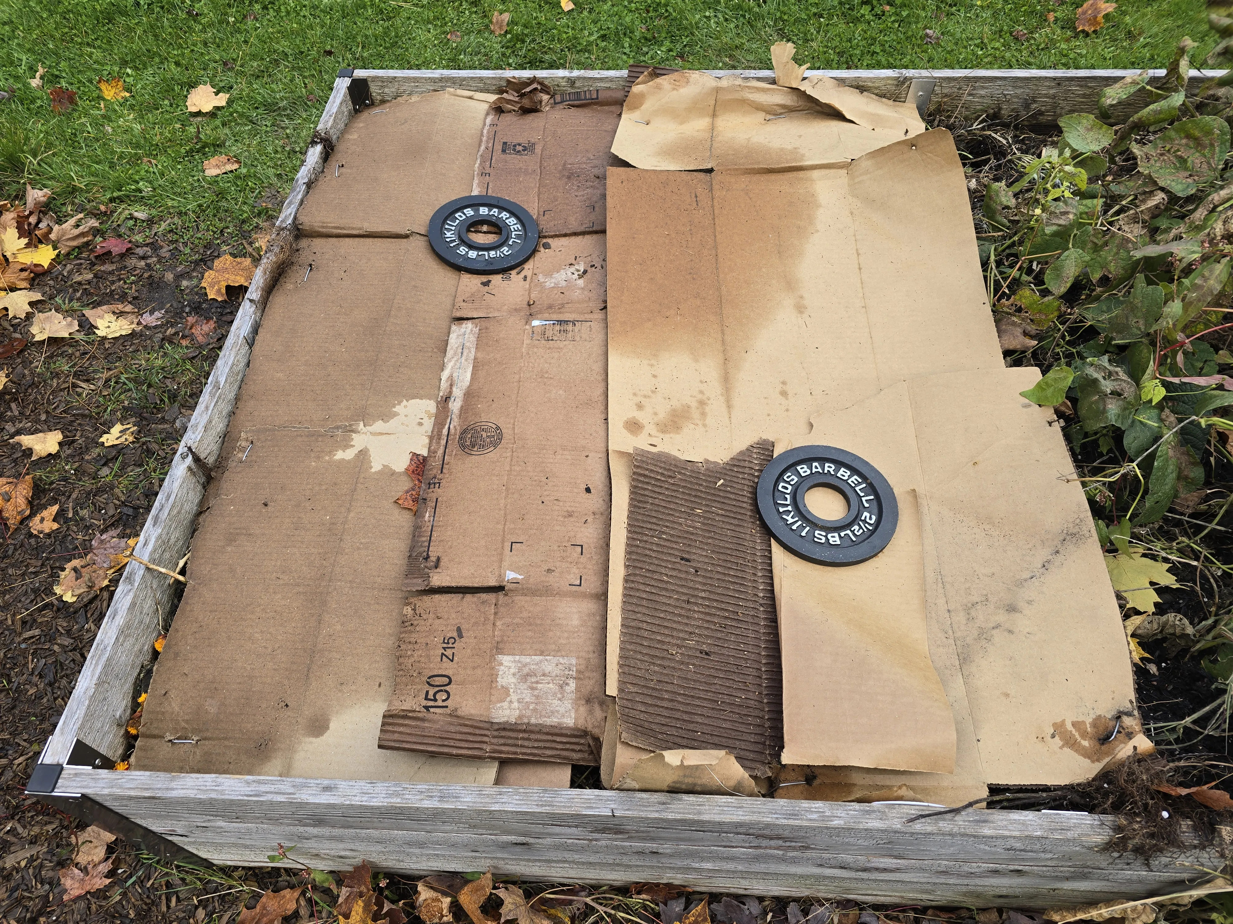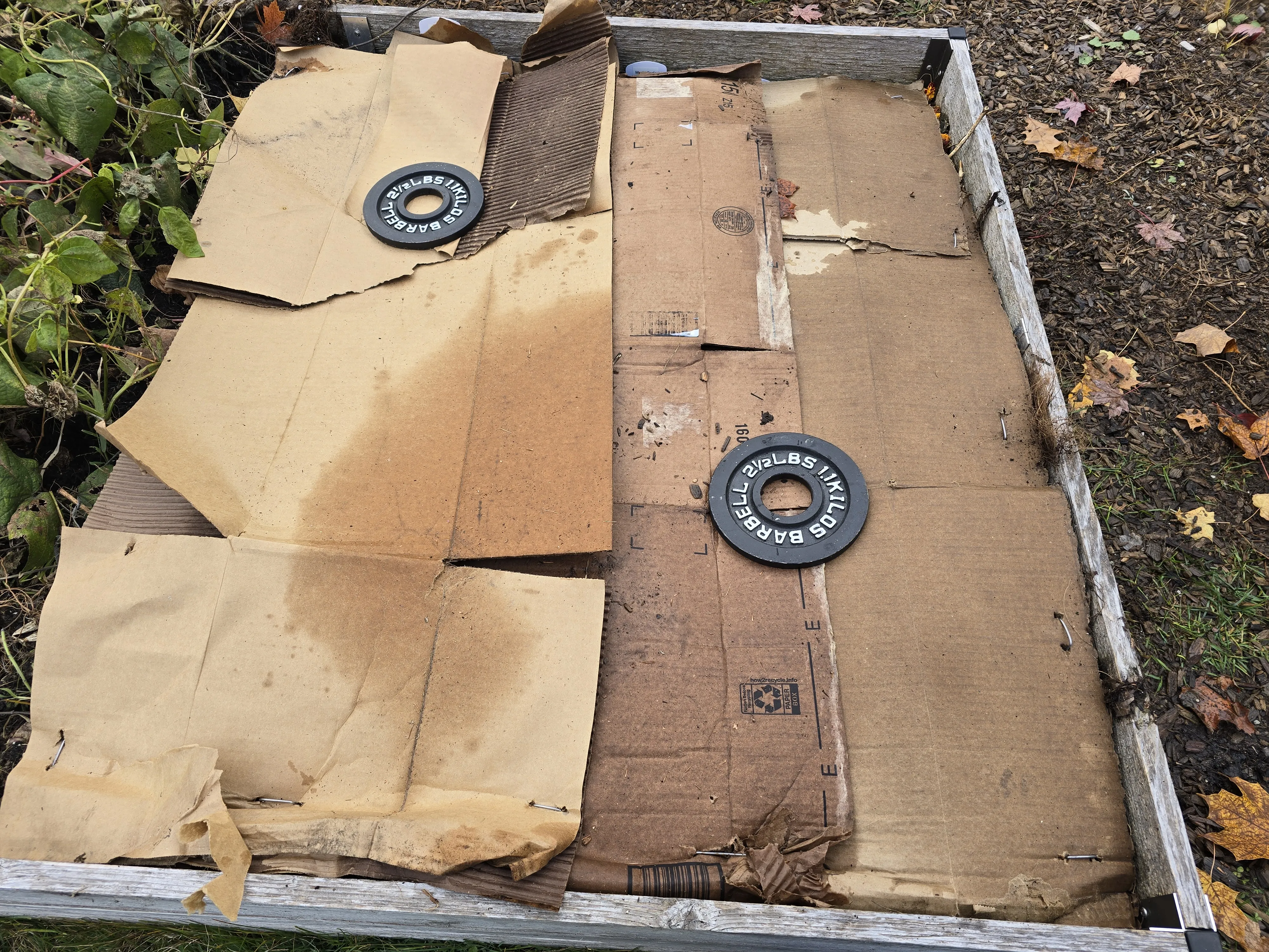Removing the cardboard for a few days did the trick at calming the mold overtaking the garden clippings in the Company Community Garden. Given the colder nights ahead in November, I placed the cardboard back. Small barbell plates were added to the top of the cardboard to prevent the wind from blowing the cardboard away. These plates were destined for the landfill, so I don’t care if they get damaged from being outside.
