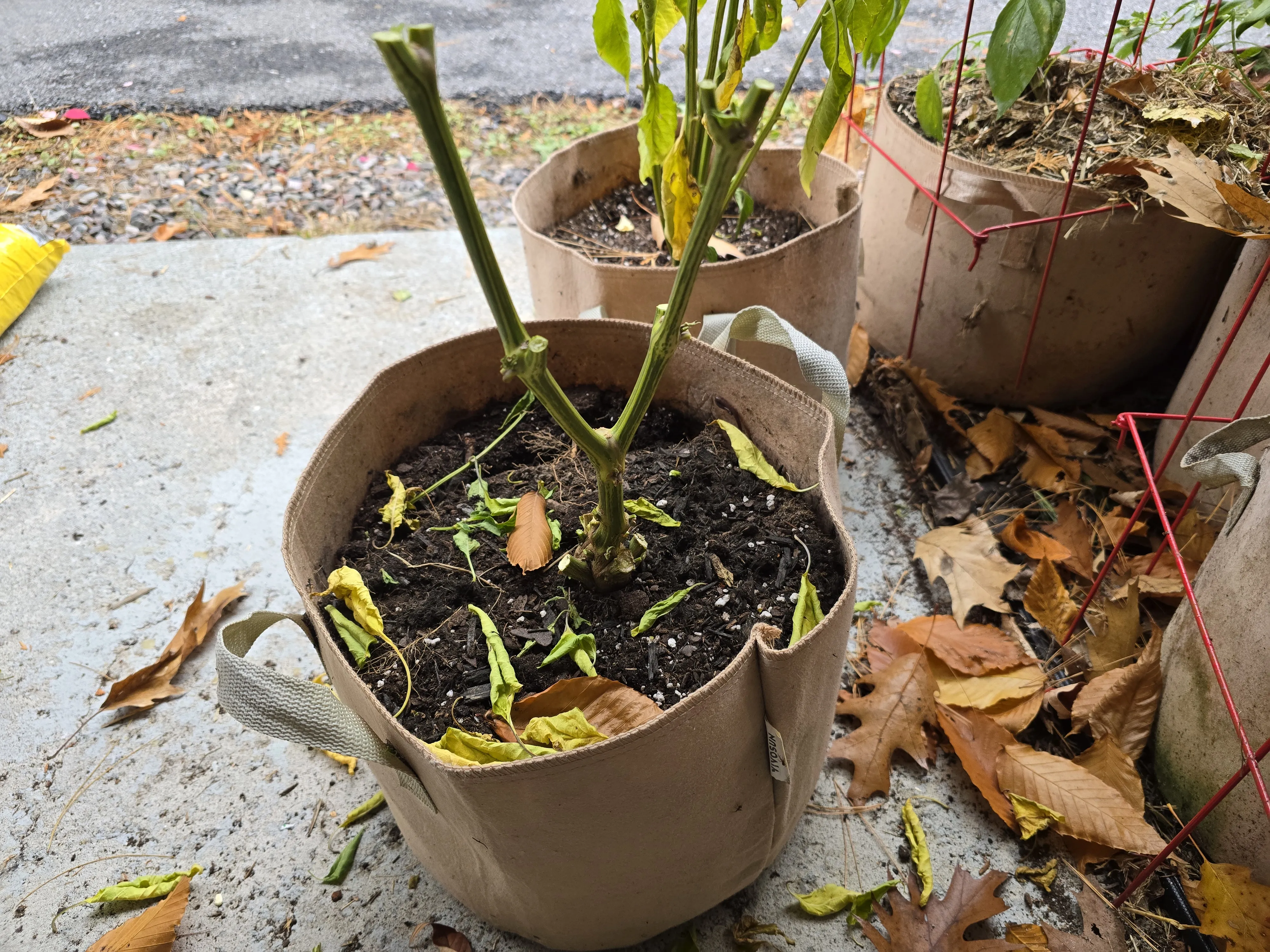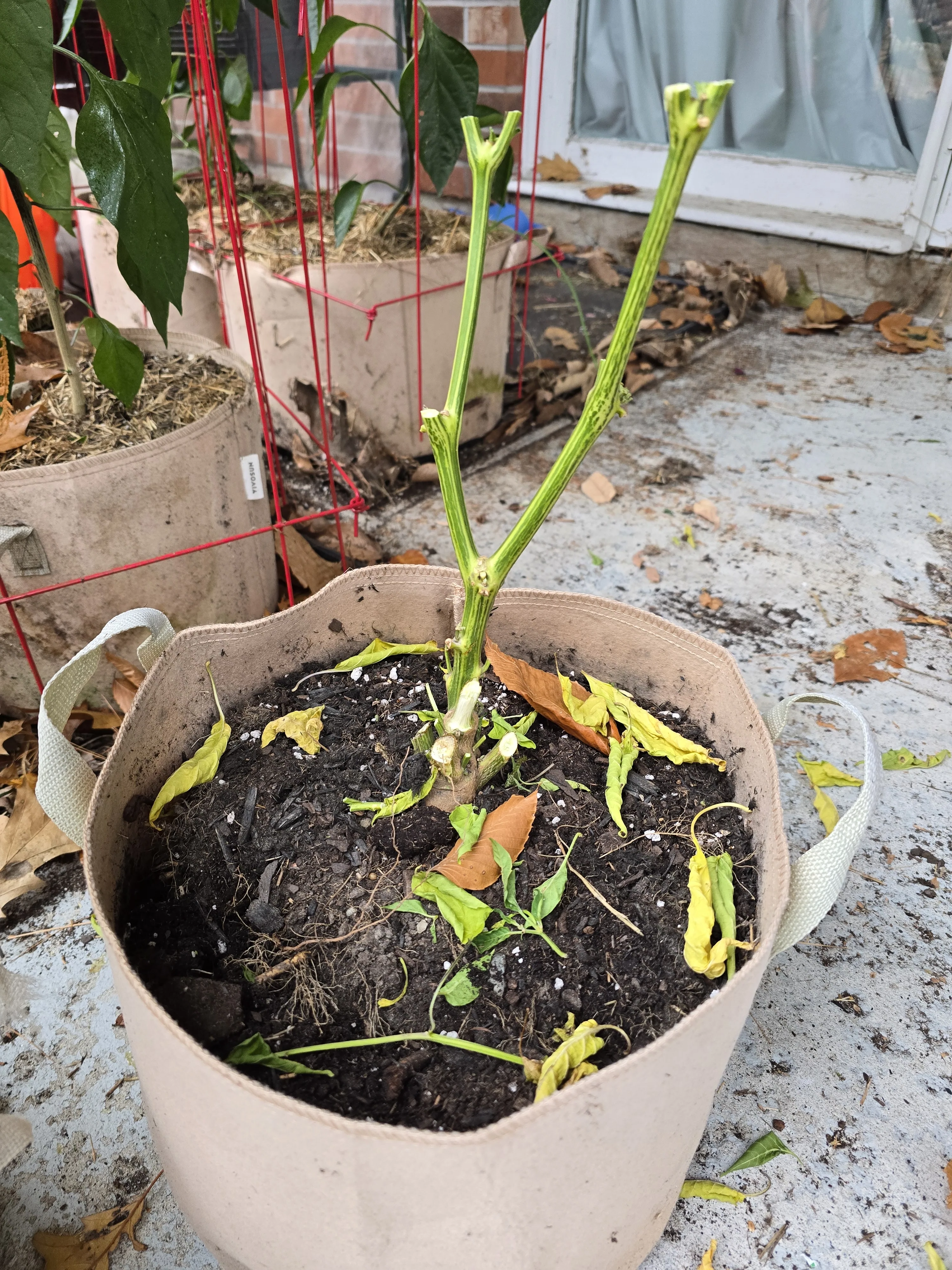 Still, the pepper leaves on most look fine, and the jalapeños that are growing fell sturdy. The only plants showing any strain from the season are the peppers that came out of the Company Community Garden. The one Stripey Sugar Rush that I’m really hoping will survive over wintering has no live leaves on it. For that one I began the pruning phase for over wintering.