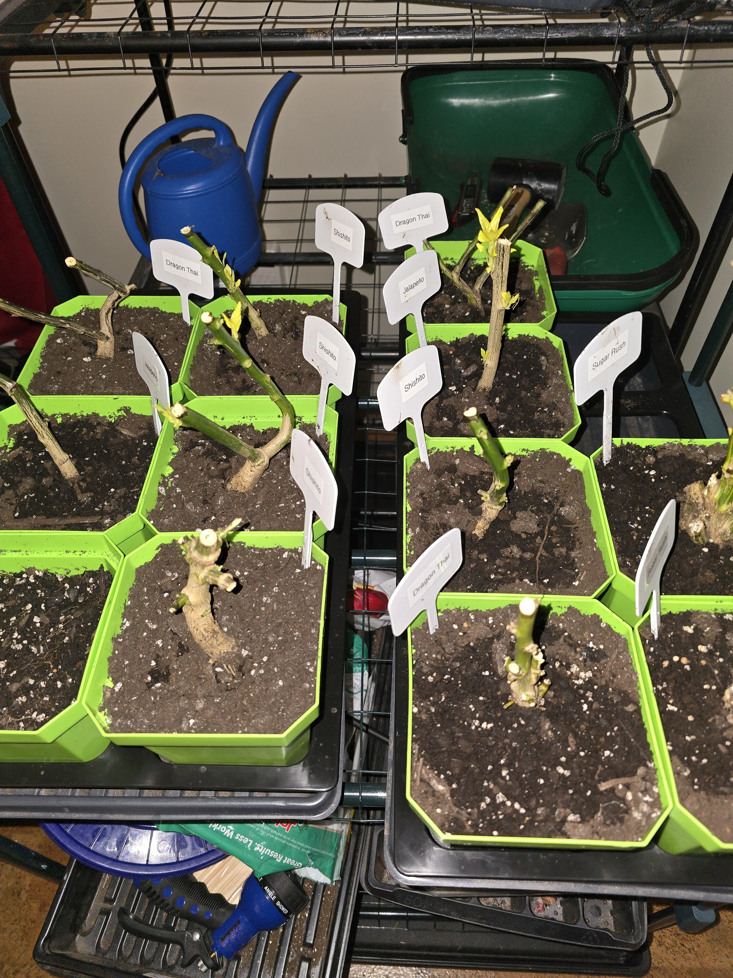 So far, 5 of the 11 pepper plants being overwintered have either small patches or leaves, or showing some green growth of some kind.