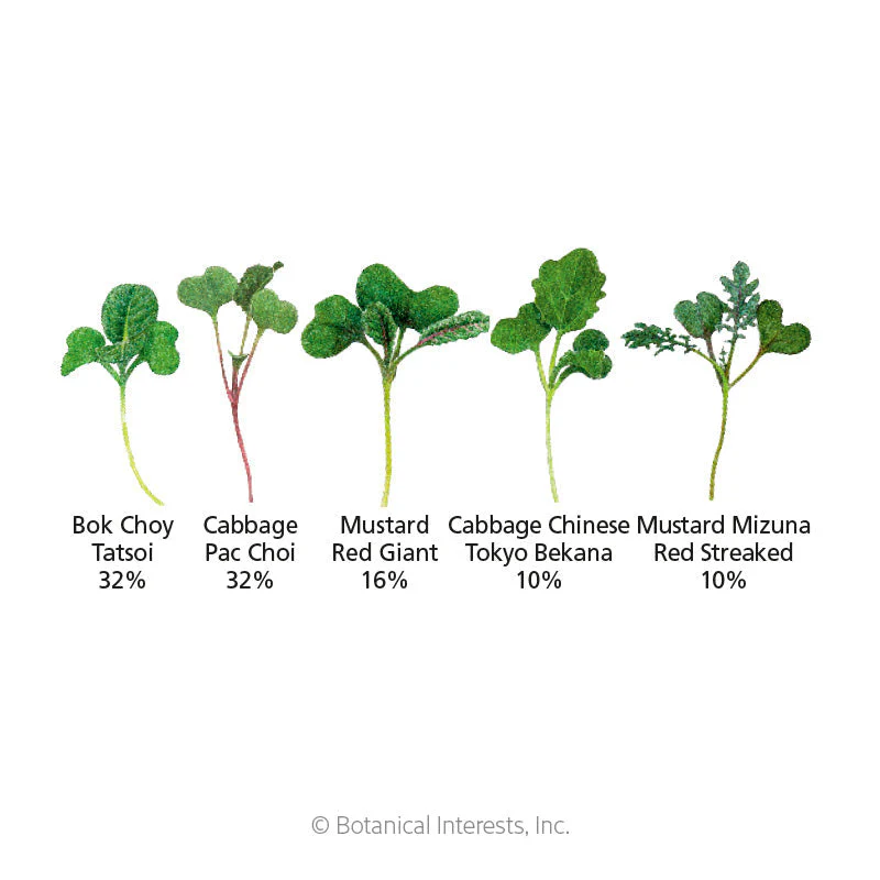 Mix includes: 32% Tatsoi bok choy, 32% Pac Choi cabbage, 16% Red Giant mustard, 10% Tokyo Bekana chinese cabbage, and 10% Red Streaked Mizuna mustard